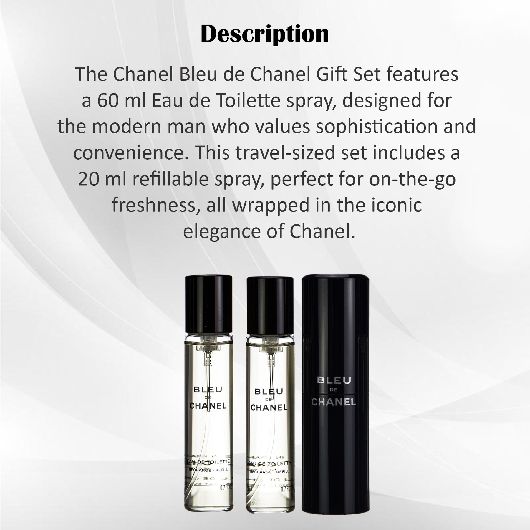Perfectly balanced with fresh, woody, and aromatic notes, Bleu de Chanel captures the essence of freedom and refined strength. The set also features a 20 ml refillable travel spray, allowing you to stay refreshed and composed wherever you go — whether at work, traveling, or a night out.