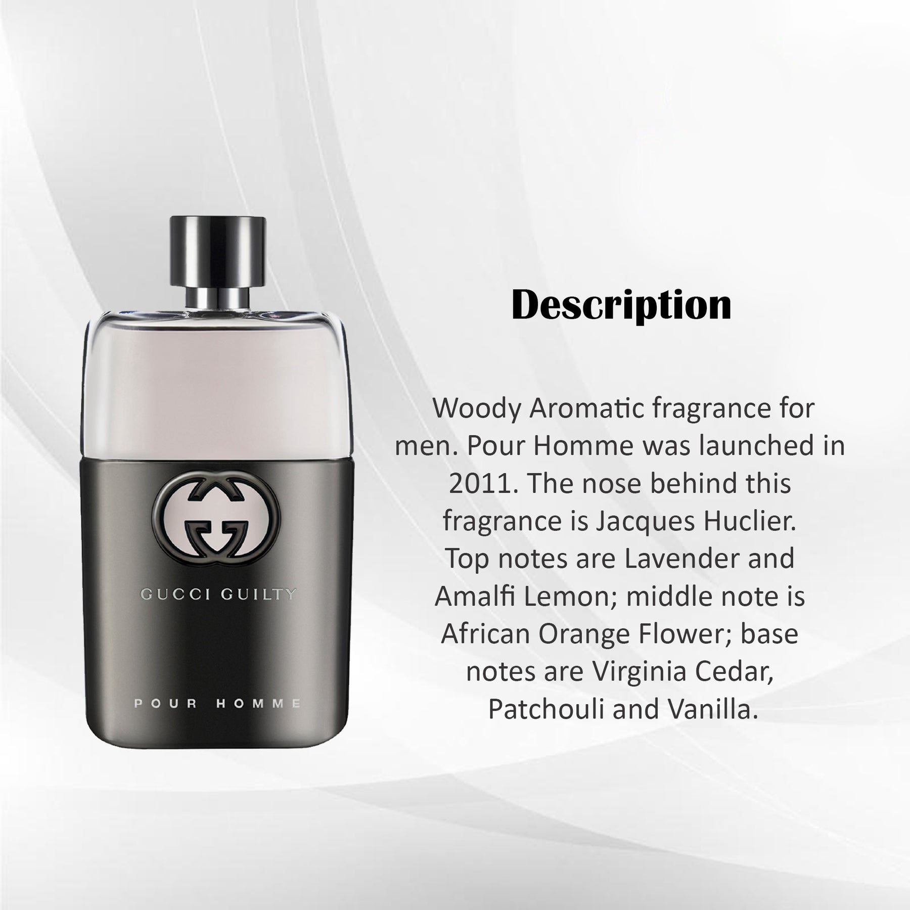 Woody Aromatic fragrance for men. Guilty Pour Homme was launched in 2011. The nose behind this fragrance is Jacques Huclier. Top notes are Lavender and Amalfi Lemon; middle note is African Orange Flower; base notes are Virginia Cedar, Patchouli and Vanilla.