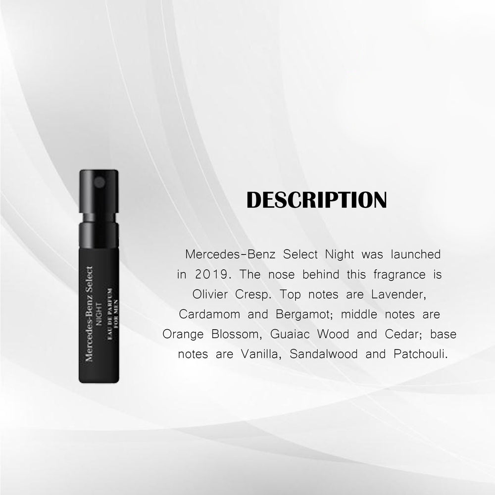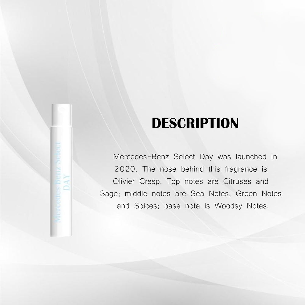 Mercedes-Benz Select Day was launched in 2020. The nose behind this fragrance is Olivier Cresp. Top notes are Citruses and Sage; middle notes are Sea Notes, Green Notes and Spices; base note is Woodsy Notes.