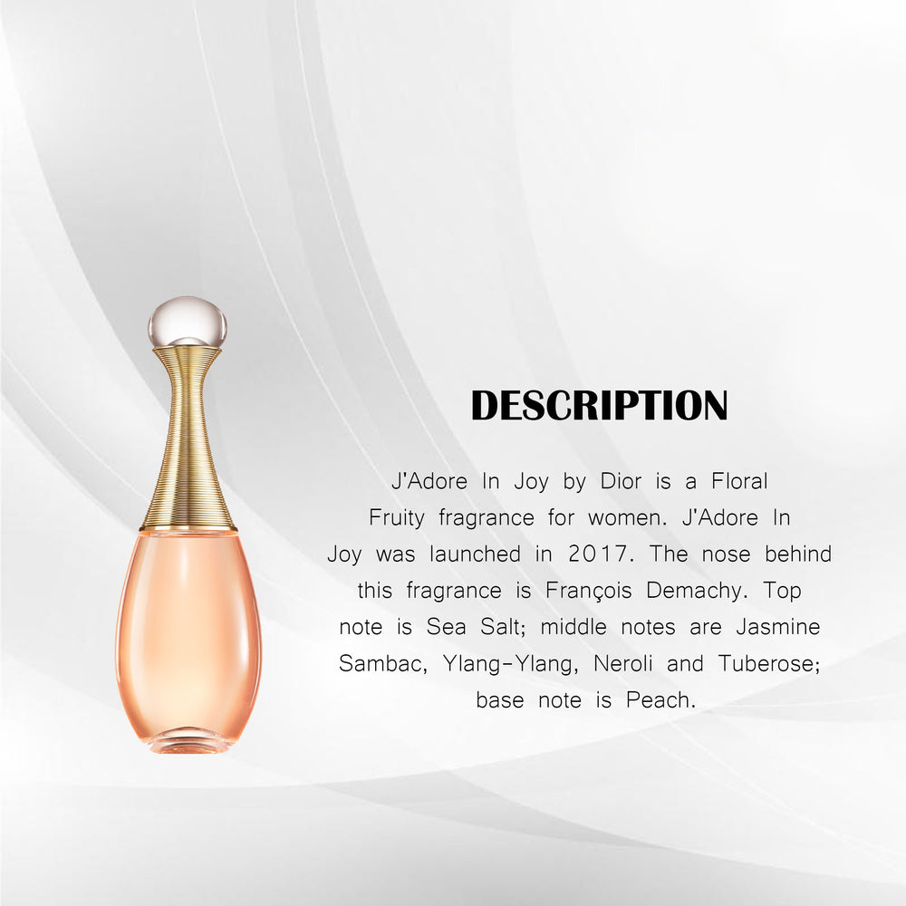 With J'adore in joy Eau de Toilette, François Demachy, Dior Perfumer-Creator, composed a fragrance with a freshness that is lively and full, soft and incisive, based on a heart of Ylang-Ylang from Madagascar and the Comoros, and custom-crafted for Dior in Grasse. A salty and unexpected fragrance.